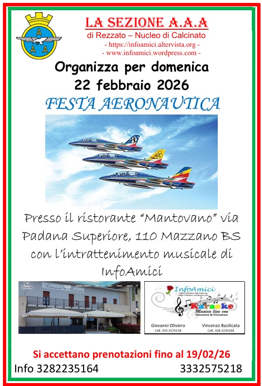 Si avvisano tutti gli Amici del Gruppo che, l’AAA di Rezzato, in collaborazione con il Nucleo AAA di Calcinato, sta organizzando una festa dell’Aeronautica presso il ristorante “Mantovano” di Mazzano -BS, domenica 22 febbraio, come riporta il volantino di seguito.